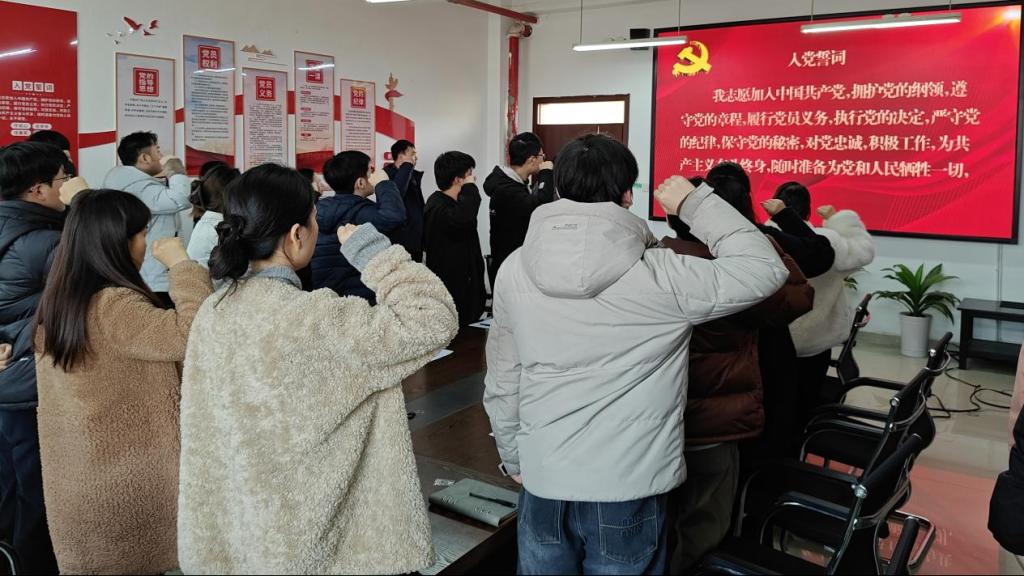 随后,大会进入重温入党誓词环节。在领誓人带领下,全体党员面向党旗庄严起立、高举右拳,逐字逐句宣读入党誓词。铿锵誓言回荡会场,让全体党员重温入党初心与坚定信念,进一步强化身份意识、责任意识与使命意识。