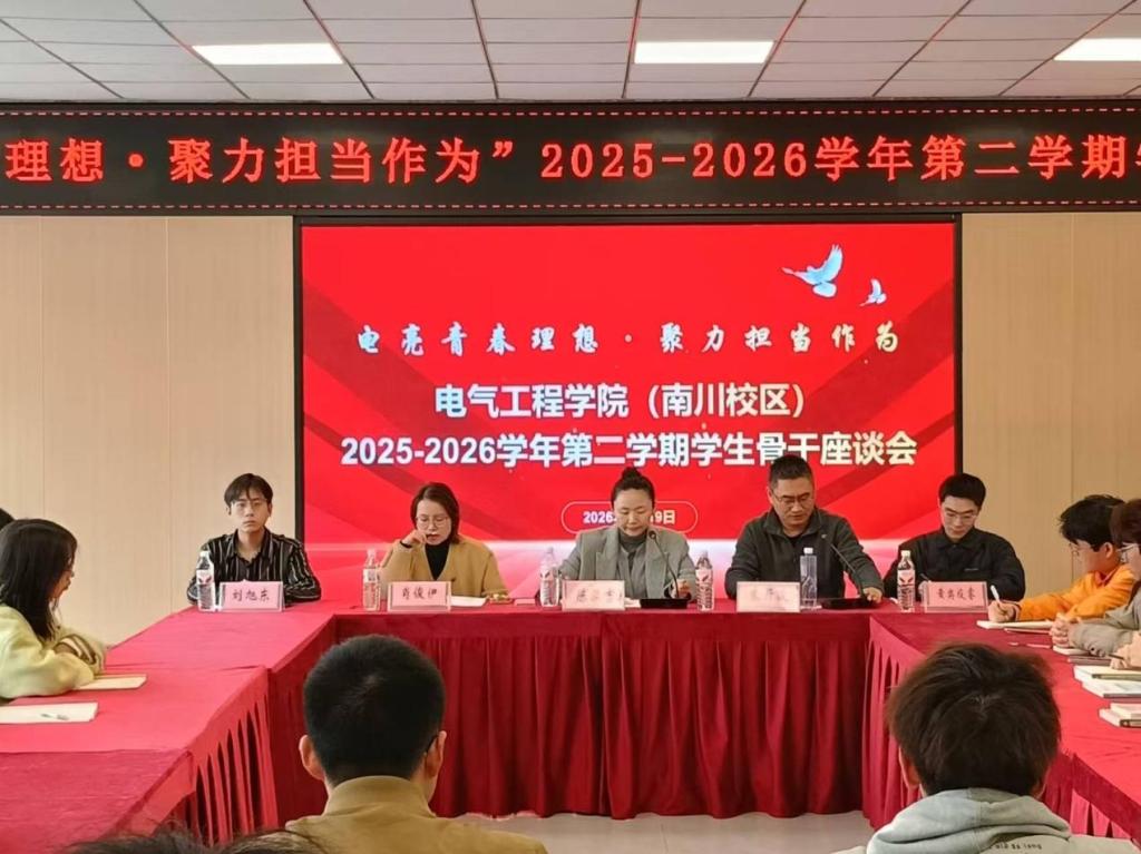 为加强学院与学生骨干的沟通交流,凝聚学生工作合力,充分发挥学生骨干的桥梁纽带与模范带头作用,3月19日,电气工程学院在南川校区风华斋(8号楼)召开2025-2026学年第二学期学生骨干座谈会。学院党总支书记陈泓吉,副院长朱开波,南川校区综合负责人肖俊伊,专职辅导员以及学院学生会临时负责人、各班班长、团支书、学习委员等学生骨干参会。